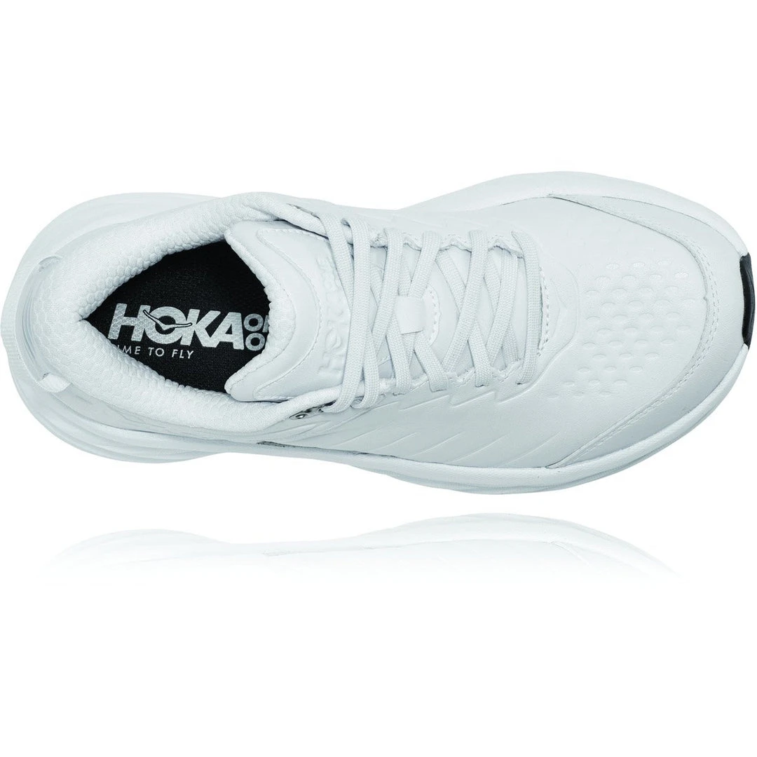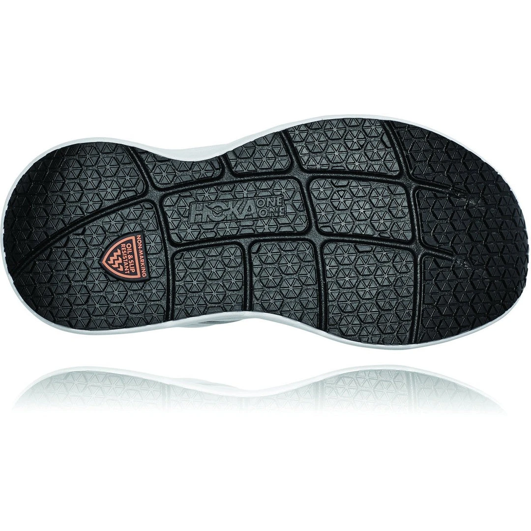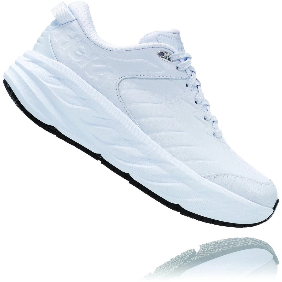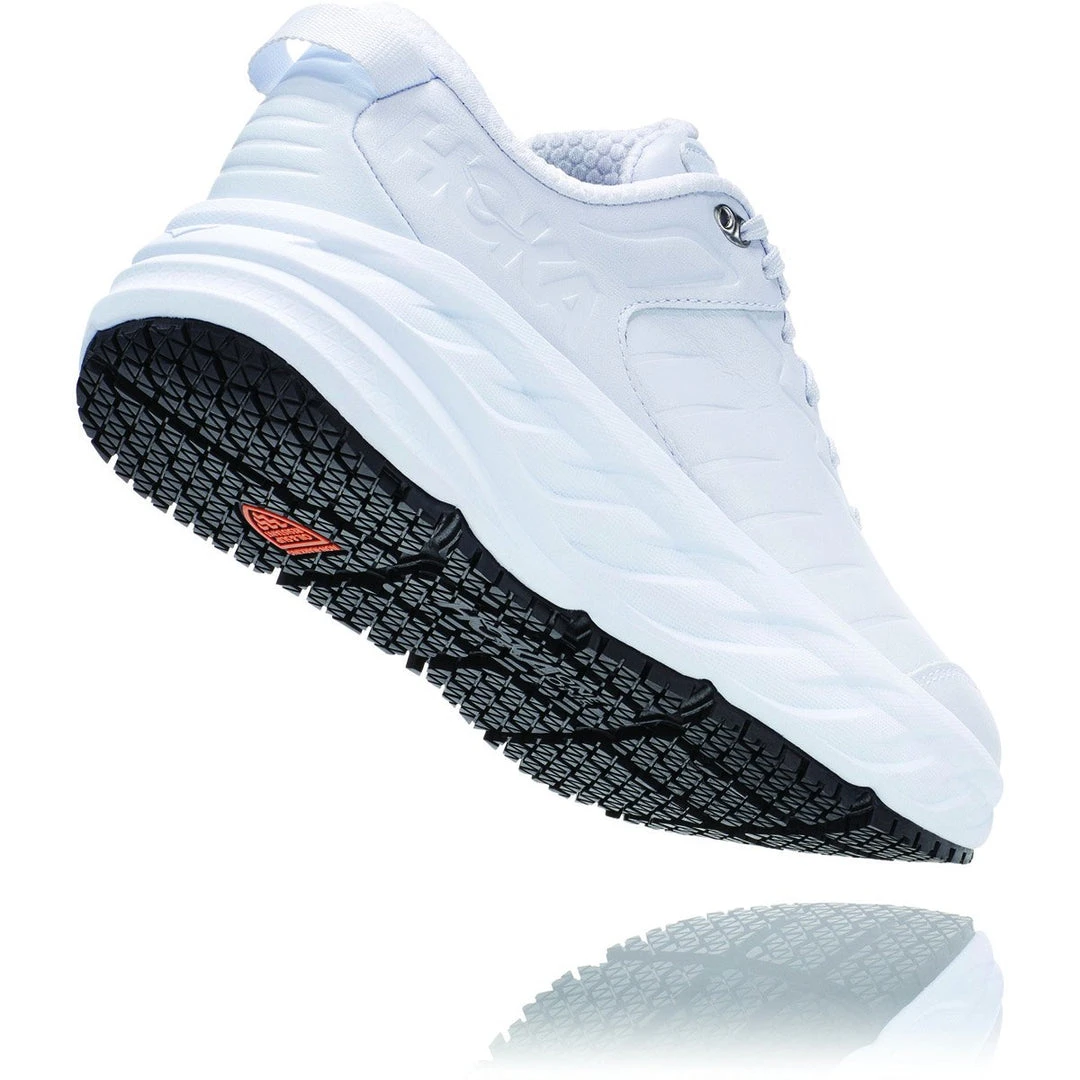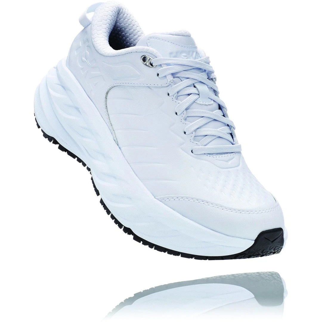 One of the first line extensions of the beloved Bondi family, the new Bondi SR takes the most cushioned shoe in the HOKA road-shoe lineup and reworks the silhouette to handle the demands of daily life. Engineered with an EVA midsole for plush, all-day cushioning, this workplace warrior has been updated with water-resistant leather and a slip-resistant outsole. Boasting a proprietary outsole compound tested against industry standards, the Bondi SR features an ultra-grippy, full ground contact rubber that stands up to the service industry and medical field alike.