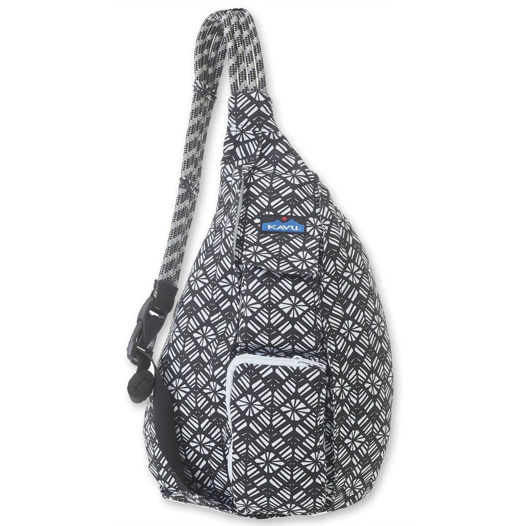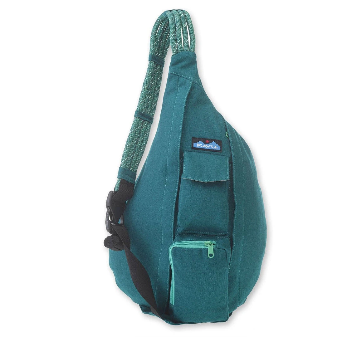 The Rope Bag features an adjustable rope shoulder strap, two vertical zip compartments, two key or cell phone pockets, and a padded back with KAVU embroidery.