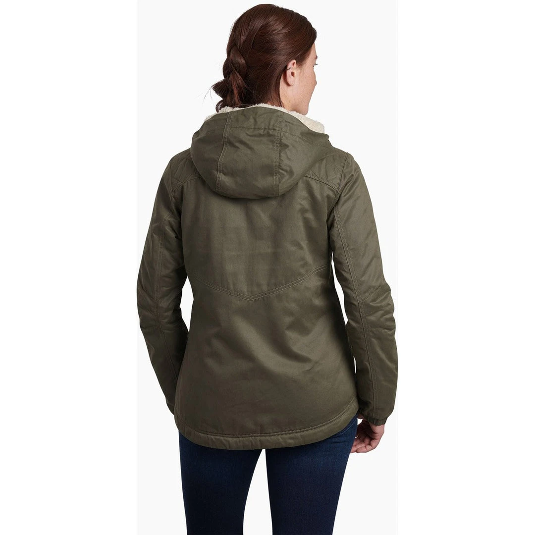 KÜHL’s CELESTE™ Lined Women’s Hoody is equipped with a wax coated exterior for rugged resistance against wind and water. A luxurious Italian fleece lining, including the hood, provides cozy warmth and comfort. A snap closure draft flap protects the center zipper and seals out the elements with style. Two zippered hand warmer pockets and an interior security pockets keep valuables protected.