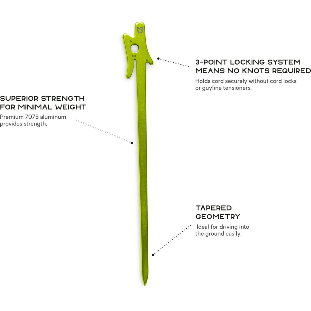 Ultralight stakes have never been so smart. Airpin’s three-point locking system holds cord tight and eliminates the need for knots, cord locks or guyout tensioners. The tapered geometry is ideal for driving into the ground and the 7075 aluminum offers superior strength for its minimal weight.