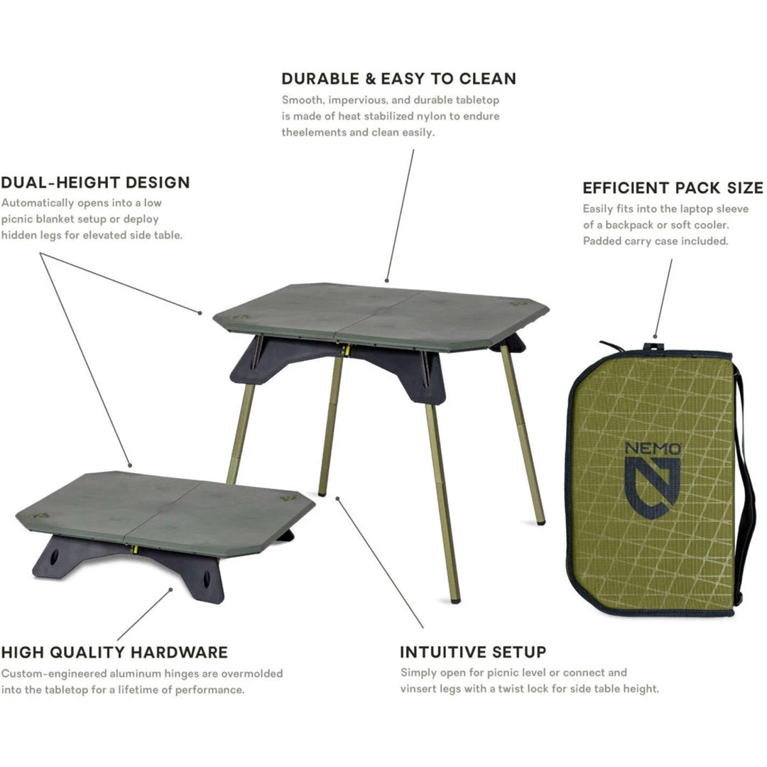 - Dual-height design offers low picnic blanket setup or deploy hidden legs for elevated side table.