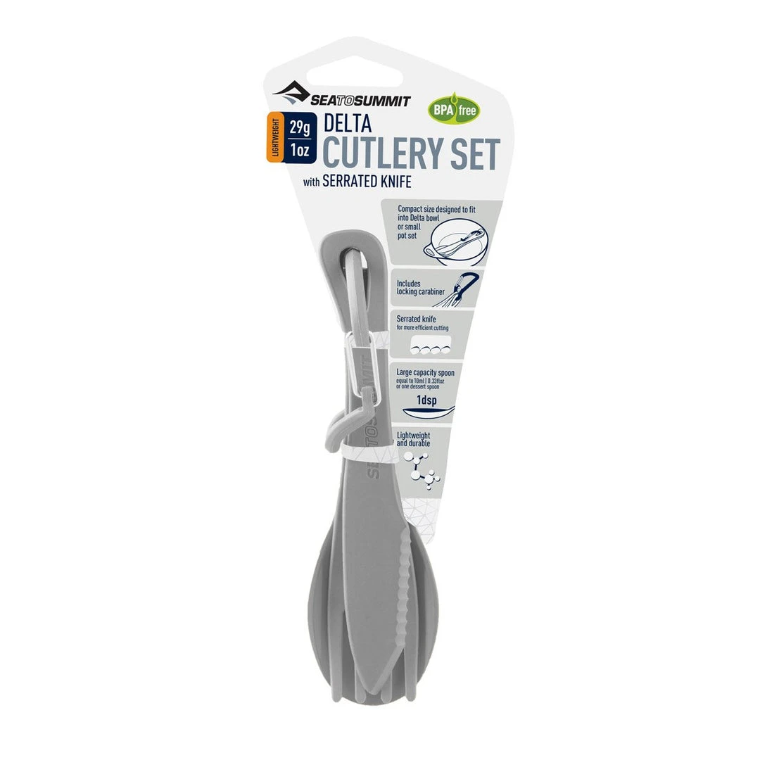 The Sea To Summit Delta Cutlery Set is a short knife, fork, and spoon utensil set designed to fit inside your Delta Bowl when camping. The supplied carabiner can be used to hang or clip the three utensils together. The knife is a part flat blade for easy spreading and part serrated for chopping.